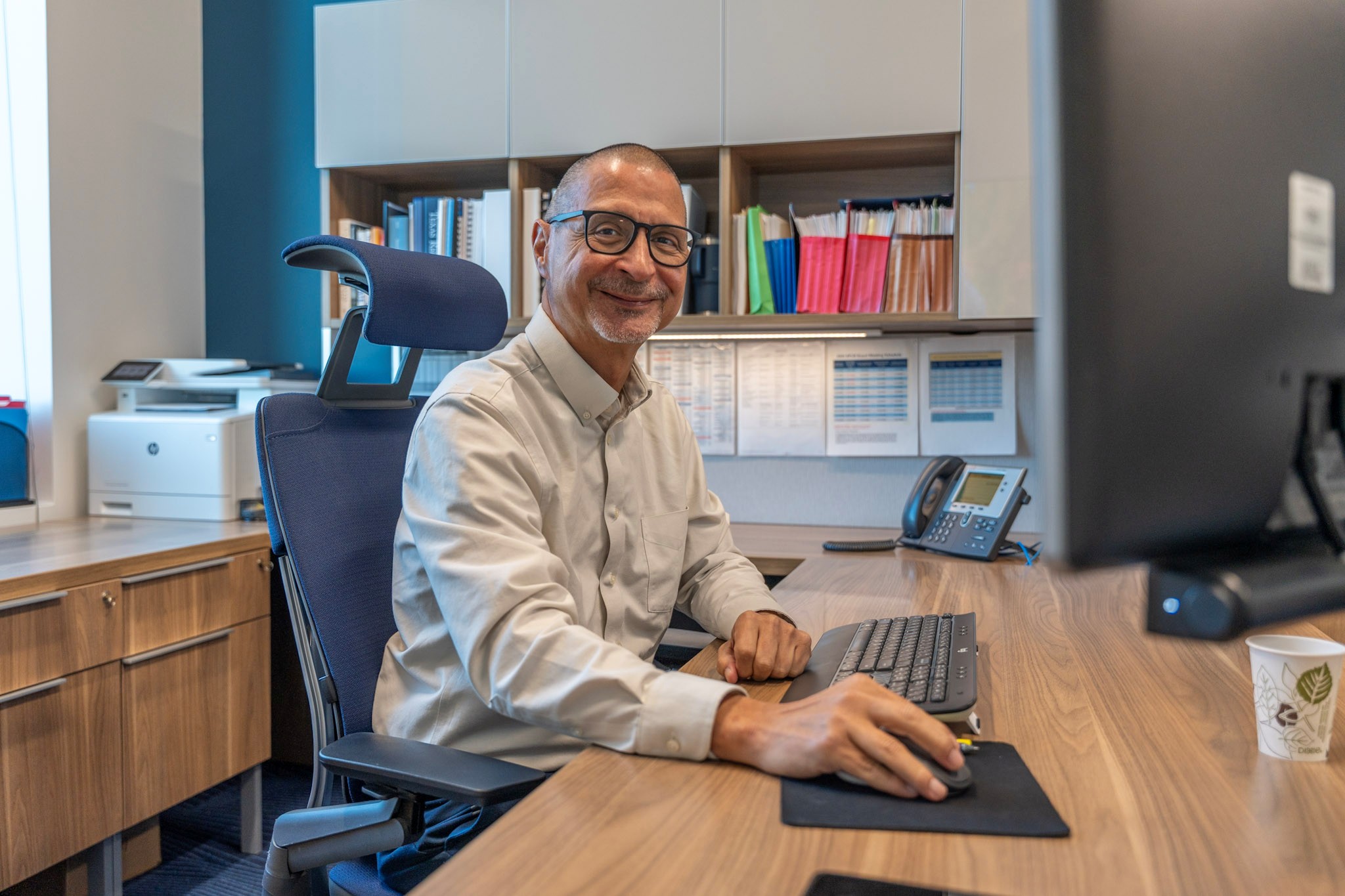 BPUB Director of Finance David Medrano sits at his desk following the finance department’s recognition by the GFOA for excellence in financial reporting.